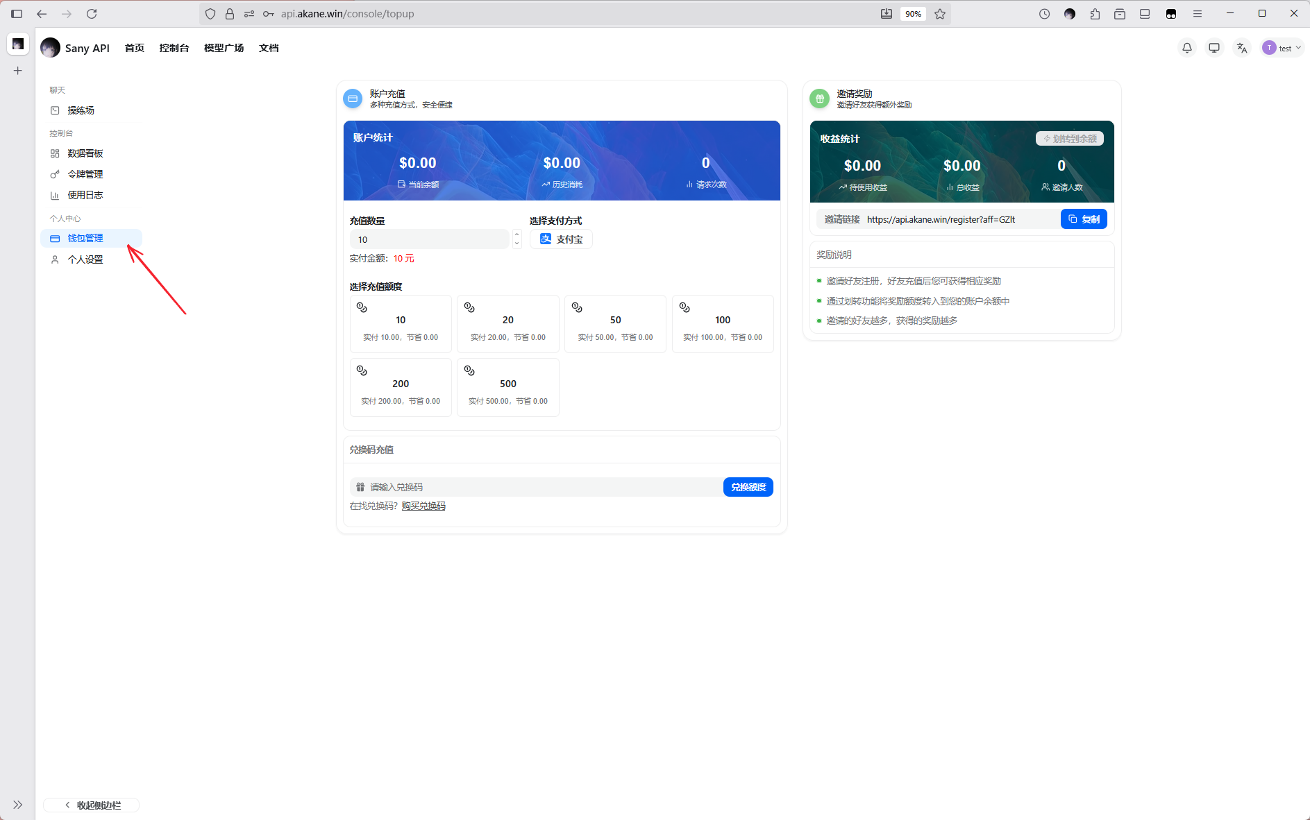 点击钱包管理充值额度,本站充值比例1:1
