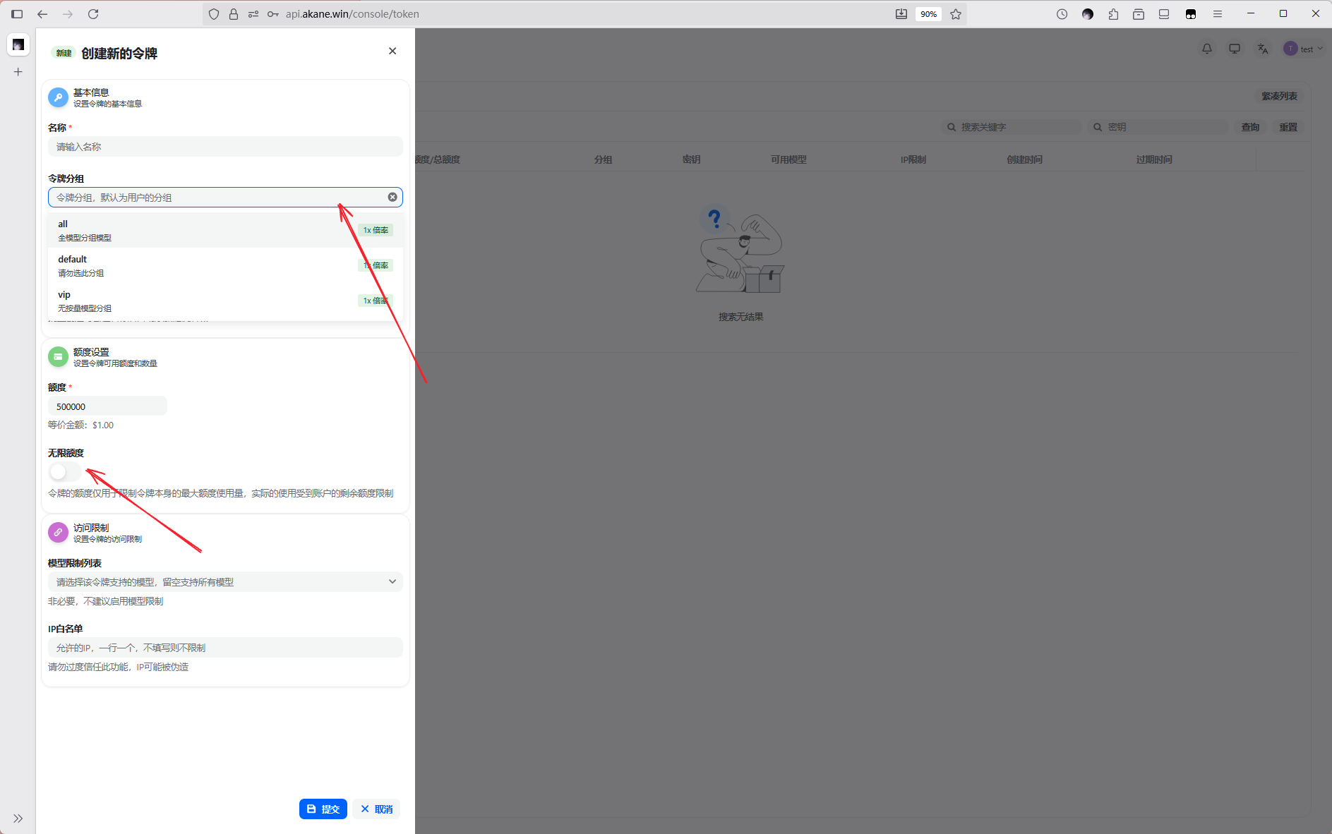 令牌名称随意填写,分组按你需求选择,如果你不用按量模型建议选择vip分组,以免误使用造成高额消费,反之选择all分组